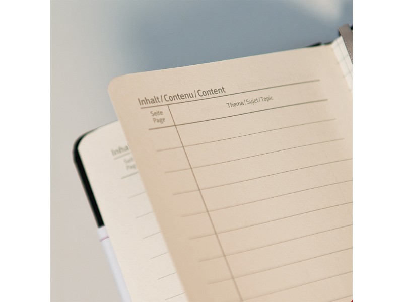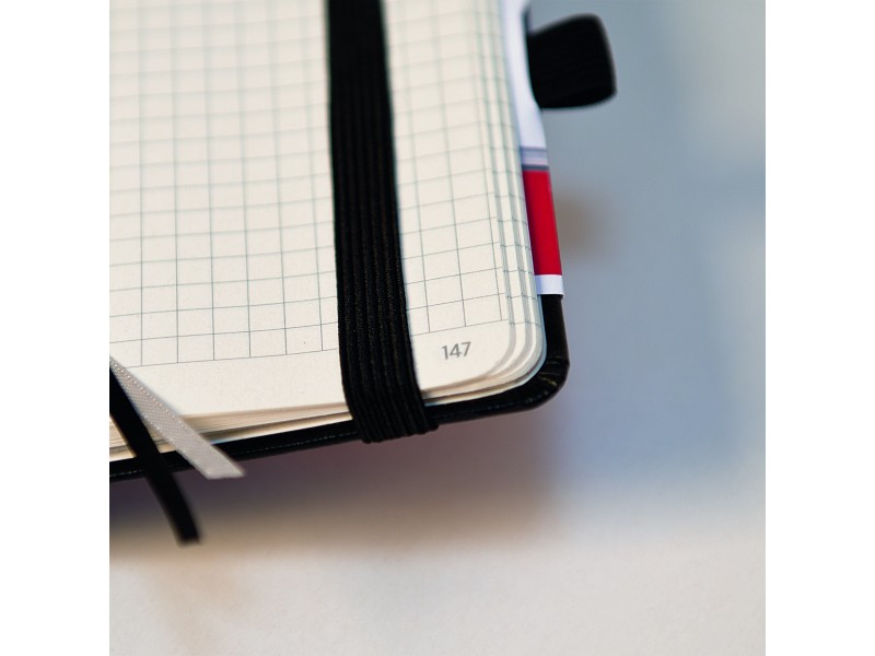 · farblich angepasste Stifteschlaufe, Gummizugverschluss, 2 Lesezeichen, Einstecktasche, 2 Rückenschilder, 1 Namensschild