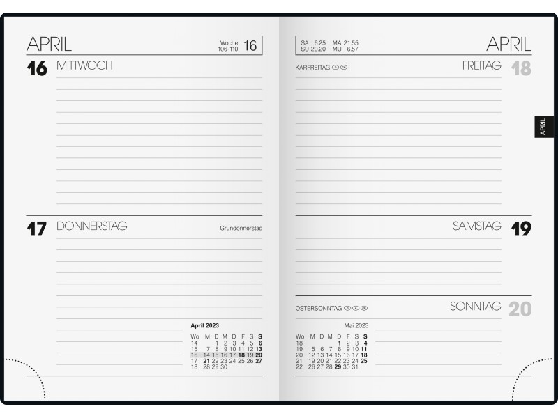 · zusaätzlich mit 32 Seiten Adressen mit Registerschnitt· 6 Seiten Monatsplan Folgejahr, Monatsplan aktuelles Jahr auslegbar, 3-teilig