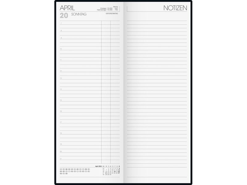 · 2 Seiten = 1 Tag, linke Seite Kalendarium, rechte Seiten für Notizen