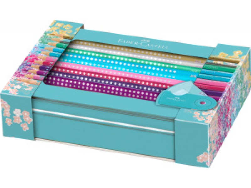 · Buntstifte in beliebter Farbauswahl, Sleeve Spitzdose Mini und Metalletui mit Sichtfenster und Blumendesign in der beliebten Farbe türkis