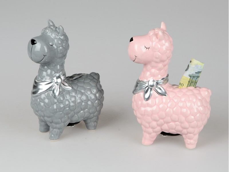 Die Spardose Alpaka hat eine Höhe von 20 cm. Es gibt sie in den Farben rosa und grau.